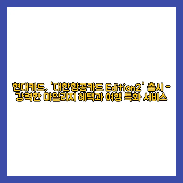 안녕하세요, 항공 및 카드 업계 관계자 여러분! 오늘은 현대카드가 선보인 '대한항공카드 Edition2' 출시 소식을 전해드리고자 합니다. 이번에 선보인 신상품은 기존 대한항공카드에 비해 한층 업그레이드된 혜택으로 고객들의 기대를 한 몸에 받고 있습니다.